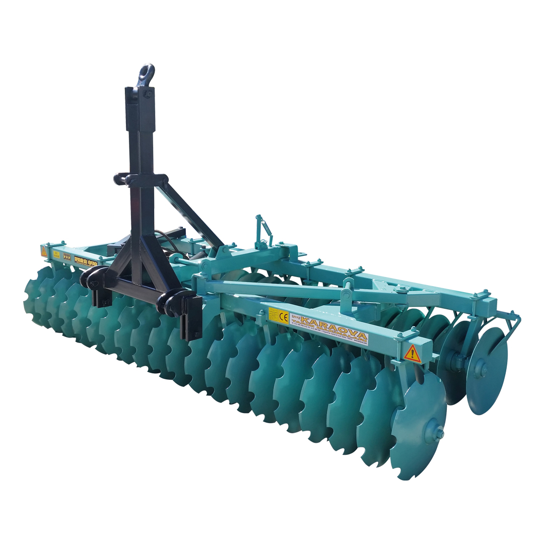 Üç askılı ve çekilir diskaro, pulluktan sonra kesekleri parçalayarak ve toprağa karıştırarak tohum yatağı hazırlamak için kullanılan bir tarım makinesidir. Bir pimin çıkartılmasıyla çekili olarak kullanılabilmesi, bir pimin takılmasıyla hidrolikli olarak kullanıma hazır hale getirilmesi özelliğine sahip bir Diskaro'dur. Hasattan sonra bitki artıklarını ve yabancı otları parçalar. Toprak üzerinde oluşan kaymak tabakayı kırar. Mineral gübreyi toprakla karıştırır. Makinamızın kavis tertibatı otomatik tertibat olarak kullanılıyor. Lif tertibatı ile makinamızın kavis vermesi oldukça kolaydır. Disk çapı 460 mm,510 mm olup iki disk arası 18 cm’dir. Teknik Özellikler KODU AÇIKLAMA DİSK ÇAPI (CM) DİSK ARASI MESAFE (MM) YATAK SAYISI ŞASE GENİŞLİĞİ (MM) İŞ GENİŞLİĞİ (CM) AĞIRLIK(KG) GEREKLİ GÜÇ (HP) 46Q 51Q KO17-20 CUTTER SERİSİ DİSKARO 20 DİSKLİ 46 51 180 6 100 x 100 x 6 180 480 520 45-50 KO17-24 CUTTER SERİSİ DİSKARO 24 DİSKLİ 46 51 180 8 100 x 100 x 6 216 570 615 55-60 KO17-28 CUTTER SERİSİ DİSKARO 28 DİSKLİ 46 51 180 8 100 x 100 x 6 252 670 725 65-70 KO17-32 CUTTER SERİSİ DİSKARO 32 DİSKLİ 46 51 180 8 100 x 100 x 6 288 760 830 75-80 KO17-36 CUTTER SERİSİ DİSKARO 36 DİSKLİ 46 51 180 12 100 x 100 x 6 324 860 935 85-90 KO17-40 CUTTER SERİSİ DİSKARO 40 DİSKLİ 46 51 180 12 100 x 100 x 6 360 950 1040 95-100 KO17-44 CUTTER SERİSİ DİSKARO 44 DİSKLİ 46 51 180 12 100 x 100 x 6 396 1050 1140 100-105 KO17-48 CUTTER SERİSİ DİSKARO 48 DİSKLİ 46 51 180 12 100 x 100 x 6 432 1145 1245 105-110